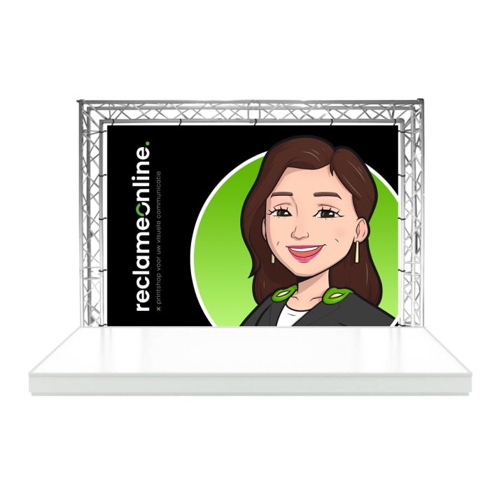 Een backdrop is een doek dat u op een podium achter de sprekers kunt hangen. Zo kijkt het publiek niet op een kale muur, maar op de boodschap van uw keuze. Of dat nu gewoon uw bedrijfsnaam of uw logo is of een volledig op maat gemaakte boodschap, dat beslist u helemaal zelf.